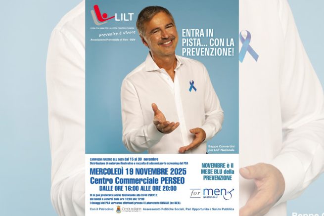 Dal 15 al 30 novembre, nel quadro della Campagna Nazionale Nastro Blu indirizzata alla Prevenzione oncologica nel genere maschile, oggi la LILT (Lega Italiana per la Lotta contro i tumori) Associazione provinciale di Rieti OSD, organizza un desk al Centro commerciale Perseo per gli uomini che vorranno aderire ad una iniziativa volta a raccogliere mediante analisi del PSA informazioni importanti per la prevenzione del tumore della prostata.