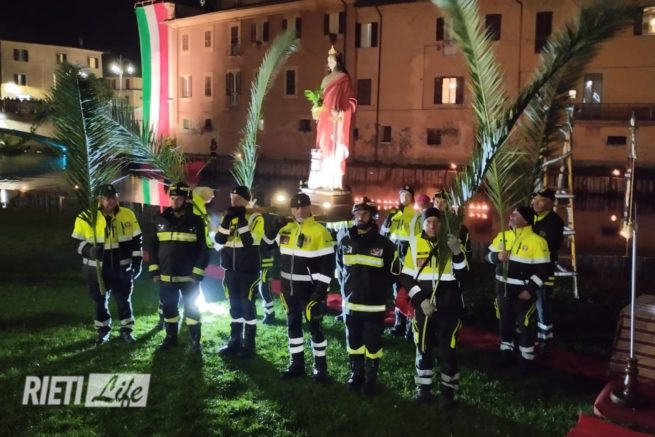 Mentre le luci si abbassavano, la statua di Santa Barbara, Patrona dei Vigili del Fuoco, è stata imbarcata e ha dato inizio alla Processione sulle Acque del Fiume Velino. L’immagine della Santa, avvolta da un’aura di luce, ha navigato scortata dalle imbarcazioni di soccorso e da una suggestiva coreografia di fiaccole tenute dai Sommozzatori del Club Rieti e dai Vigili del Fuoco.