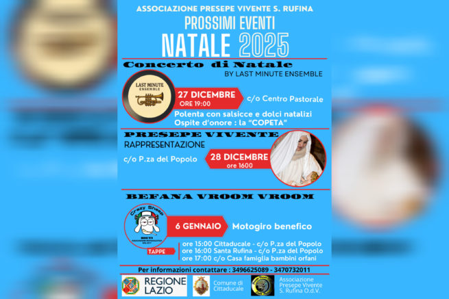 L’associazione Presepe Vivente Santa Rufina O.d.V. invita tutta la cittadinanza a partecipare alla quinta edizione del Presepe Vivente, in programma sabato 28 dicembre alle ore 16.00 in Piazza del Popolo, a Santa Rufina. Un appuntamento ormai atteso, che punta a far riscoprire una tradizione millenaria attraverso l’arte, la partecipazione e il senso di comunità.