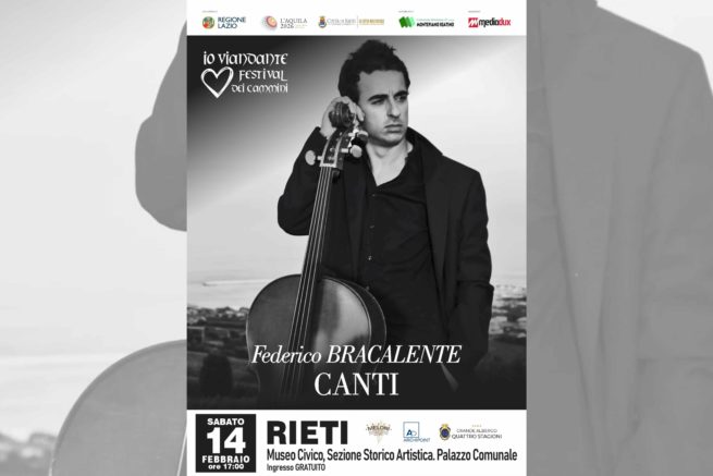Prosegue il progetto “Io Viandante. Festival dei Cammini”, promosso dall’assessorato alla cultura del Comune di Rieti e finanziato dalla Regione Lazio. Il terzo appuntamento è “Canti” con Federico Bracalente al violoncello, in programma sabato 14 febbraio alle ore 17 nella sezione storico-artistica del Museo Civico (IV Piano sede comunale, P.zza Vittorio Emanuele II). L’ingresso è gratuito.