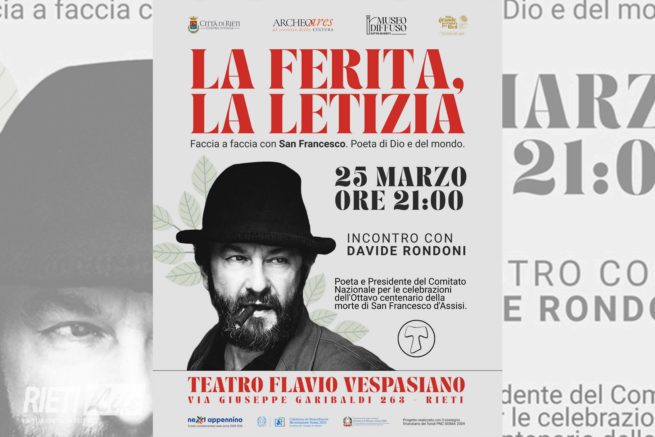 Davide Rondoni a Rieti in occasione del Dantedì. Mercoledì 25 marzo 2026 alle ore 21 il poeta e scrittore, presidente del Comitato nazionale per le celebrazioni dell’ottavo centenario della morte di San Francesco d’Assisi, terrà al Teatro Flavio Vespasiano la lectio magistralis “La ferita, la letizia. Faccia a faccia con San Francesco. Poeta di Dio e del mondo”. L’evento è organizzato da Archeoares e ospitato dal Museo Diffuso Città di Rieti, in collaborazione con l’Assessorato alla Cultura del Comune di Rieti. Nel suo libro “La ferita, la letizia”, Davide Rondoni propone un incontro intenso e personale con Francesco d’Assisi, lontano dalle immagini stereotipate e dalle rappresentazioni edulcorate che spesso accompagnano la figura del santo. Immaginando un intimo dialogo con Francesco, Rondoni racconta l’uomo dietro al santo, “un uomo capovolto, ben più di un rivoltoso”, mai incline ai compromessi, umile e tormentato eppure ricolmo di una letizia e una fede incrollabili che lo hanno condotto al cospetto di un papa e persino di un sultano. Poeta visionario, l’esperienza mistica di Francesco è stata celebrata da molti intellettuali – come Dante Alighieri, che ne ricorda le vicende nella Divina Commedia – ed è stato anche sceneggiatore teatrale, con l’allestimento del primo presepe a Greccio.