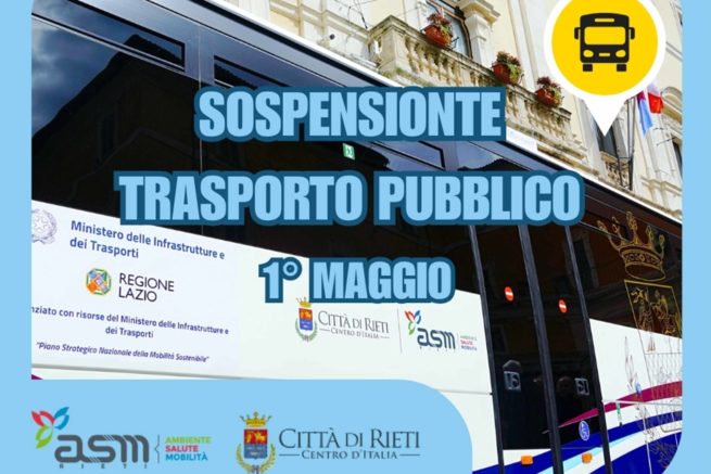 ASM Rieti S.p.A. informa che, in occasione della Festa dei Lavoratori, nella giornata di venerdì 1° maggio 2026 il servizio di Trasporto Pubblico Locale sarà sospeso.