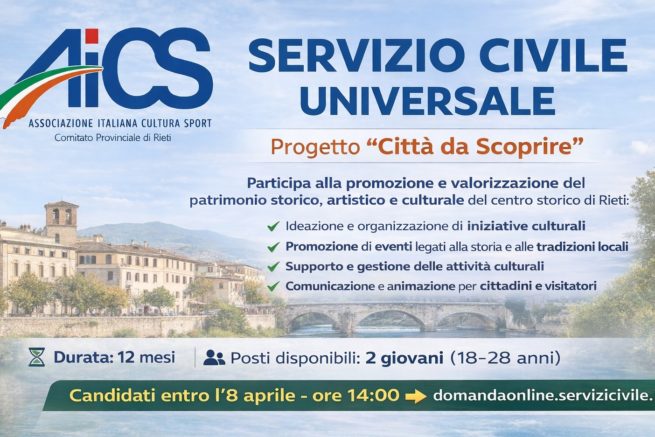 Candidature fino a domani per il Servizio Civile Universale – Progetto “Città da Scoprire” a Rieti con AICS